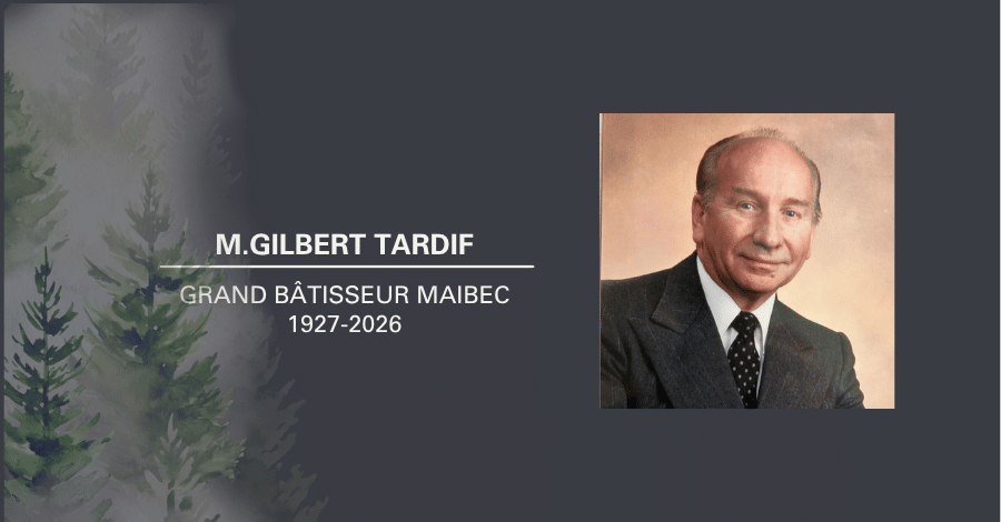 M. Gilbert Tardif, grand bâtisseur de la compagnie Maibec, est décédé à l’âge de 99 ans, le 18 mars 2026. Il aura eu une vie active et comblée de succès. Sa simplicité, son écoute des autres, sa grande intelligence, le désir de bâtir son entreprise ainsi que d’être un contributeur significatif à l’évolution de l’industrie forestière du Québec lui auront amené une très grande reconnaissance de ses pairs et de ses employés.